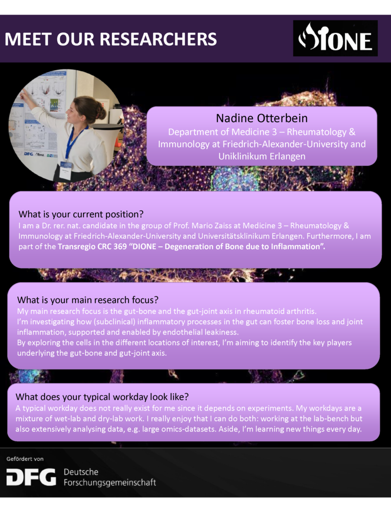 News Meet our Researcher: Mario Zaiss What is your current position? I am Professor for Immune Tolerance and Autoimmunity at the Department of Medicine 3 – Rheumatology & Immunology at more Meet Our Researcher: Nadine Otterbein What is your current position? I am a Dr. rer. nat. candidate in the group of Prof. Mario Zaiss at Medicine 3 – Rheumatology more Previous events